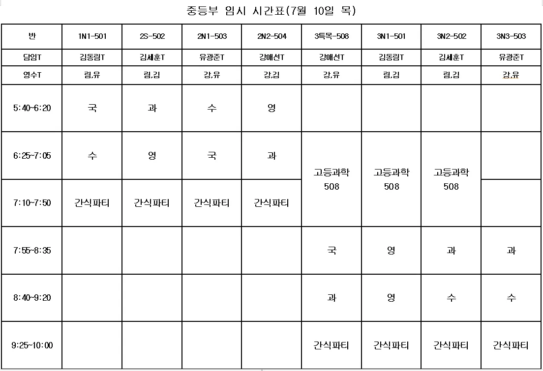 기말고사 종료 후 7월7일(월요일)부터 적용되는 주중시간표입니다.