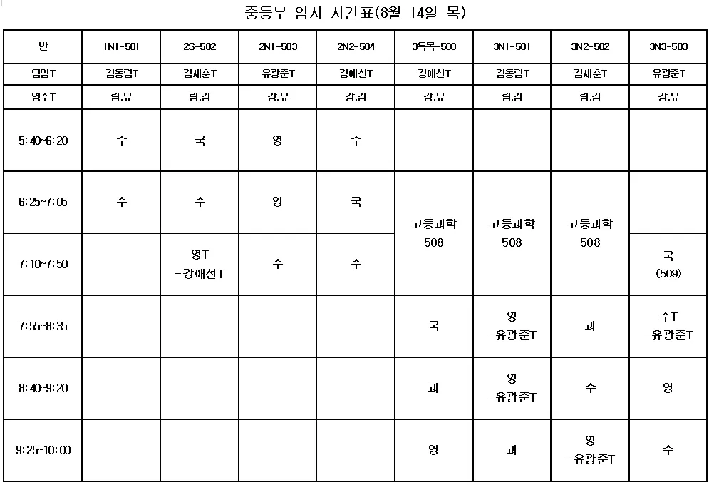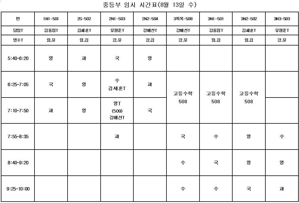 8월13~14일 (수~목요일) 임시시간표(8/8기준