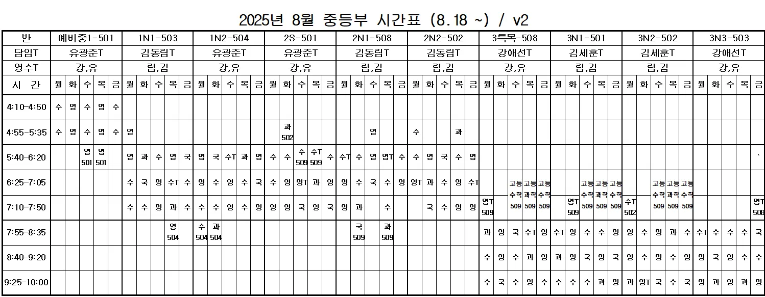 8월18일 이후 적용되는 2학기 주간 시간표입니다.