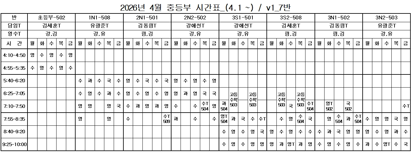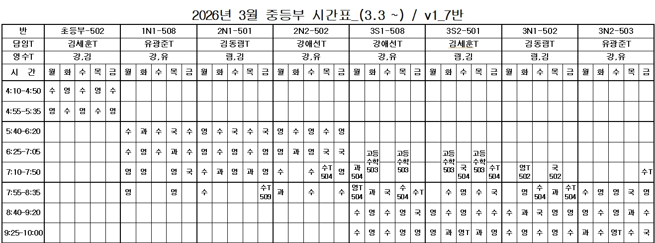 중3은 예비고1로 고등부 시간표로 이관되었습니다.