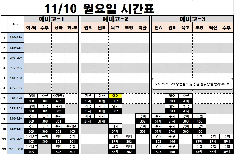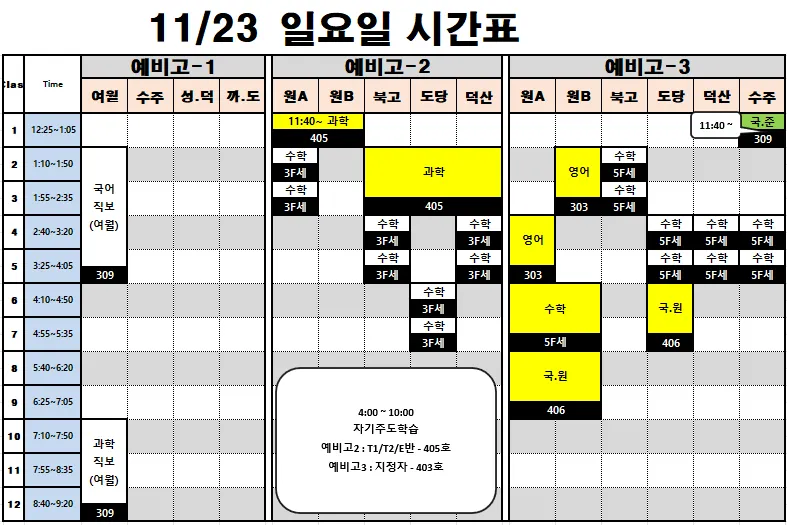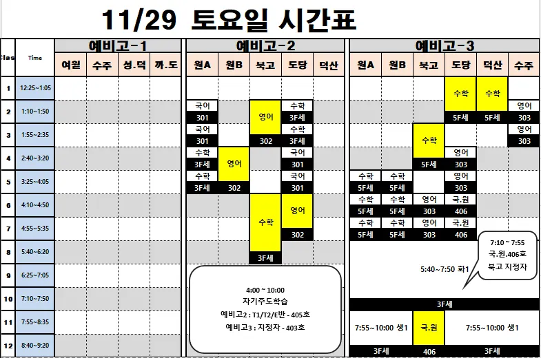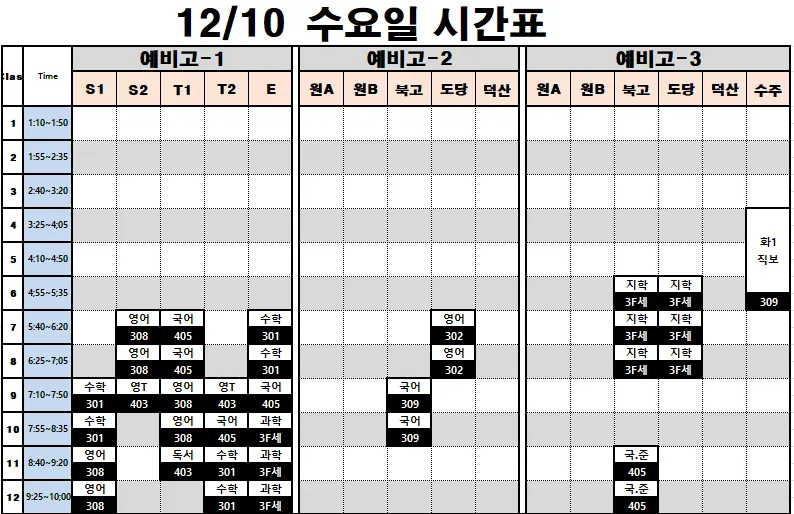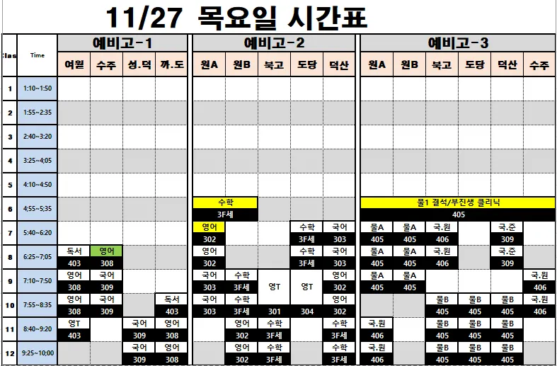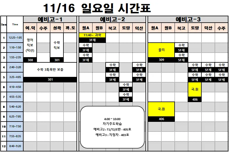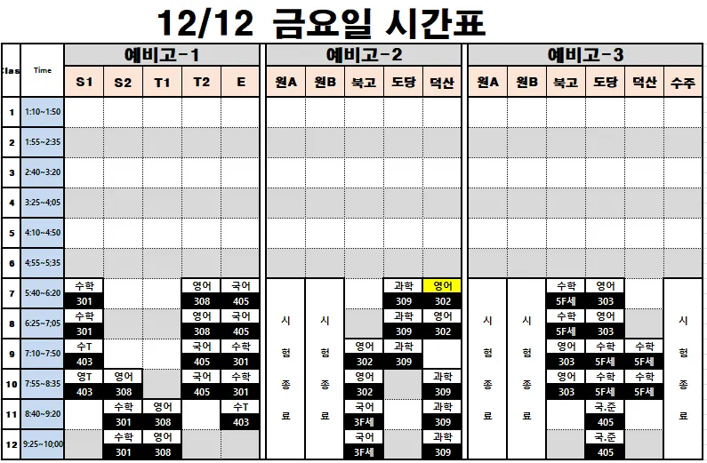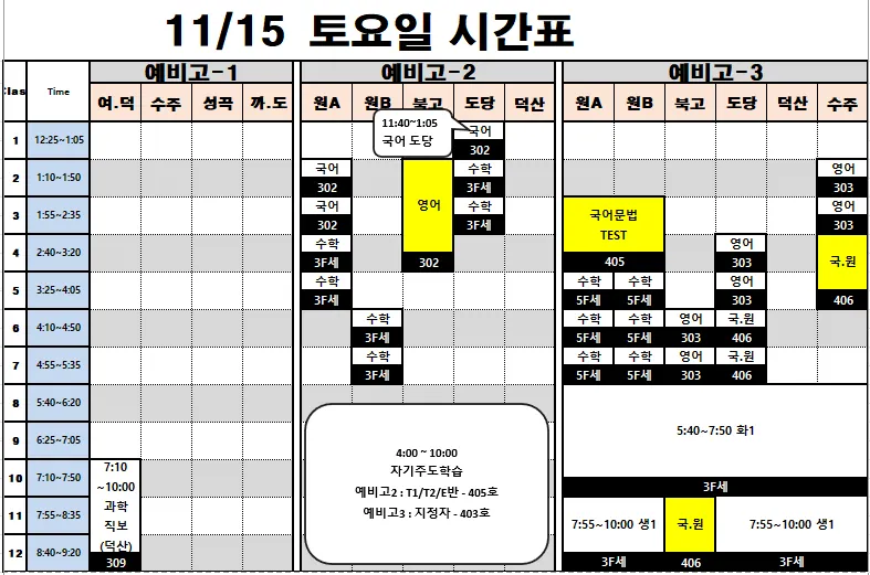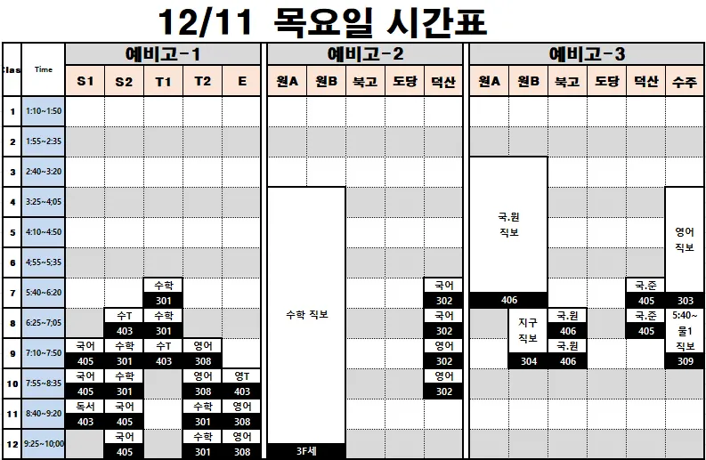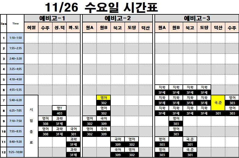 예비고1(중3) / 예비고2(고1) / 예비고3(고2) 로 시간표 변경되었습니다.