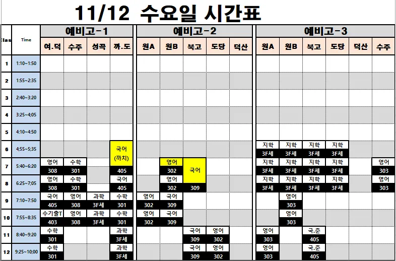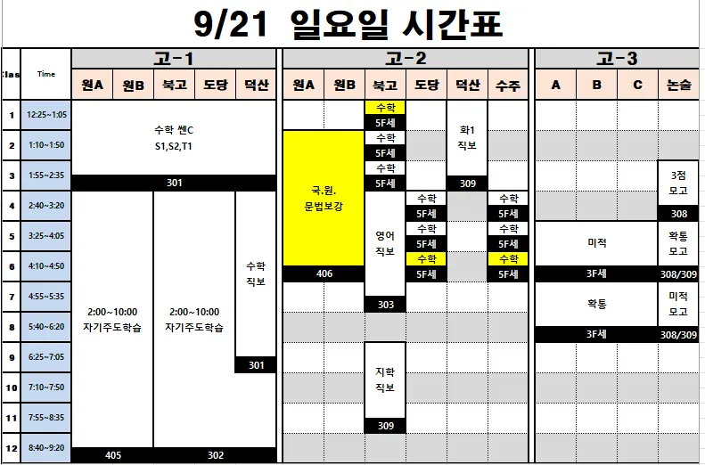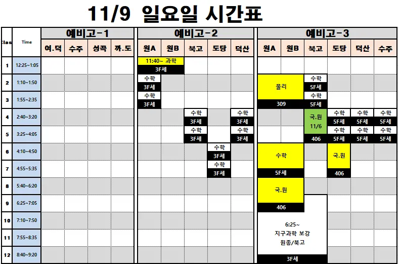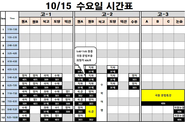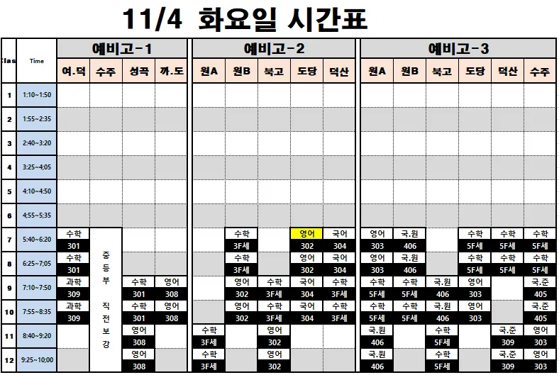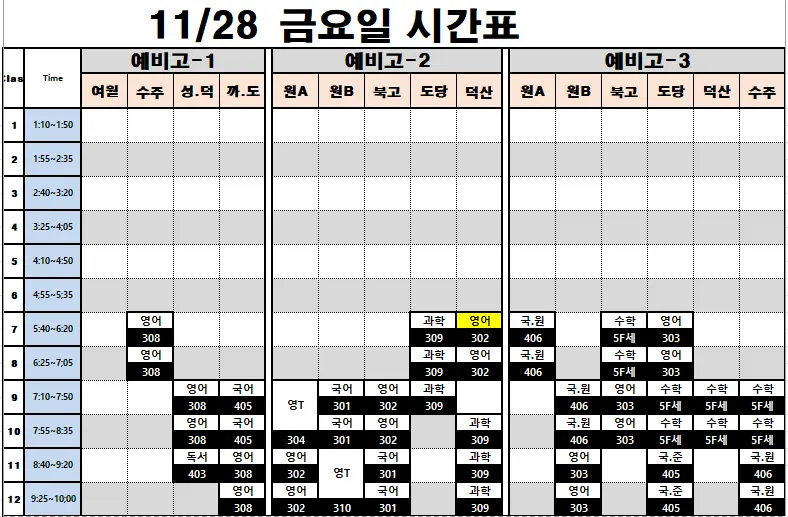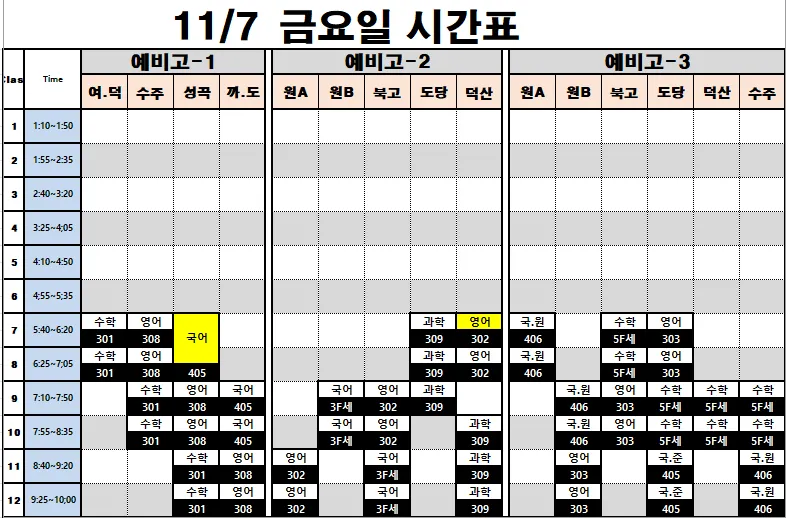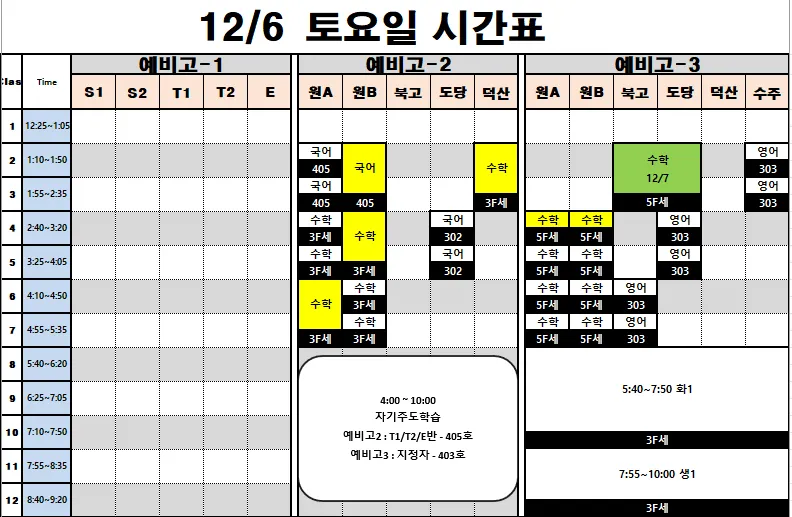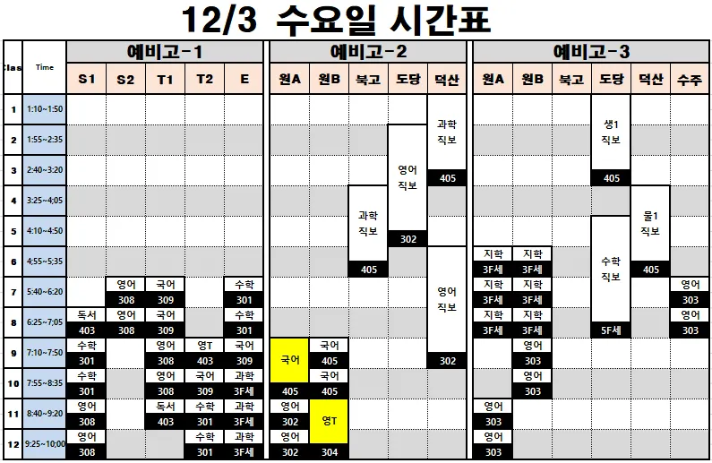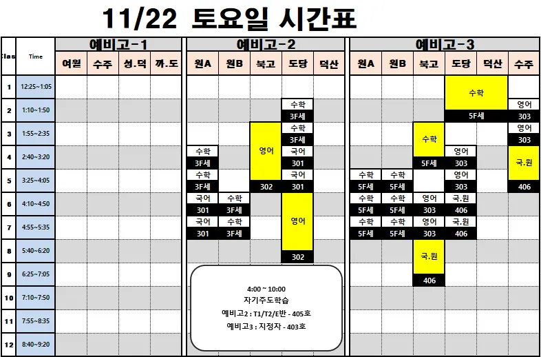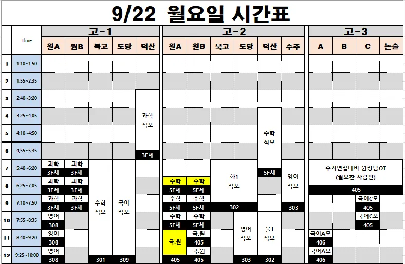 예비고1(중3) / 예비고2(고1) / 예비고3(고2) 로 시간표 변경되었습니다.