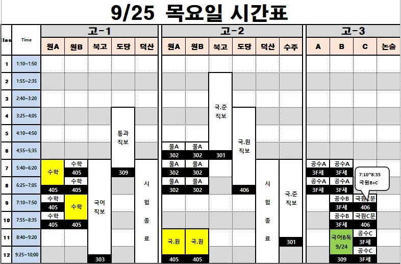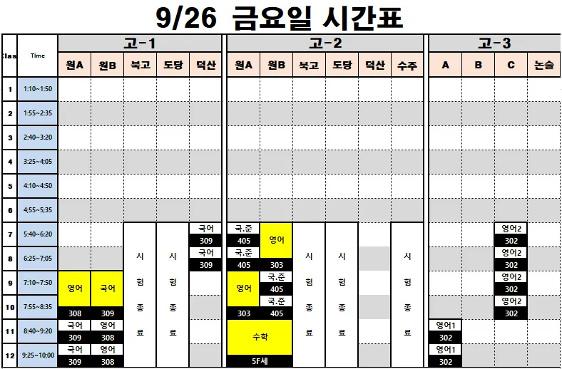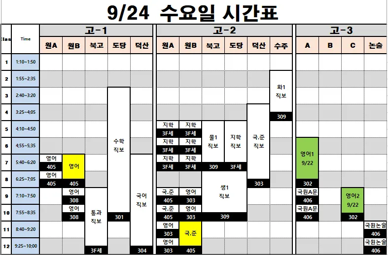 9월22일~9월26일(월~금요일) 주중시간표-수정(9/25기준)