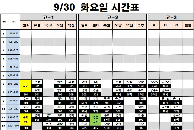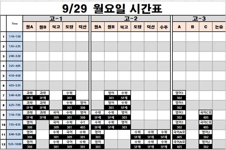 9월29일~10월3일(월~금요일) 주중시간표-수정(10/1기준)