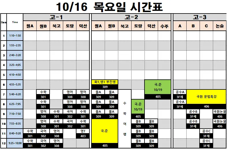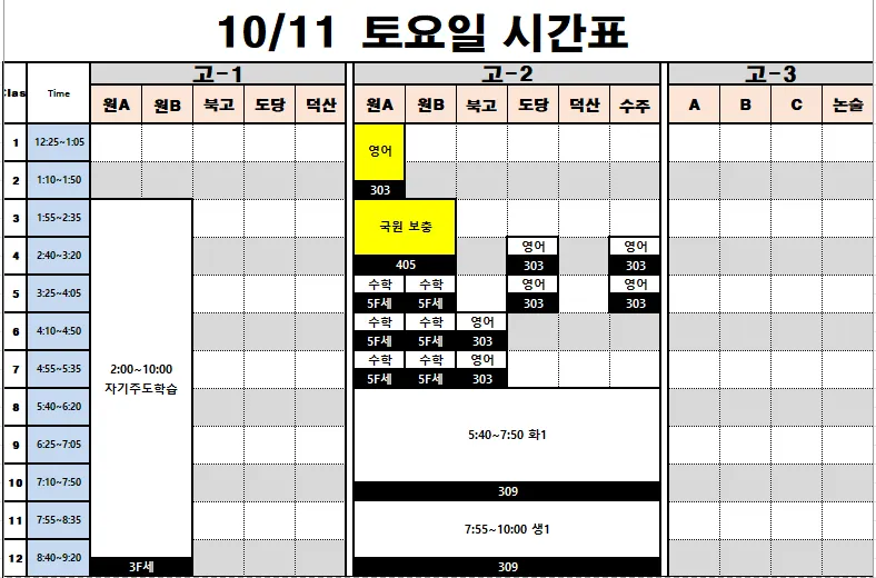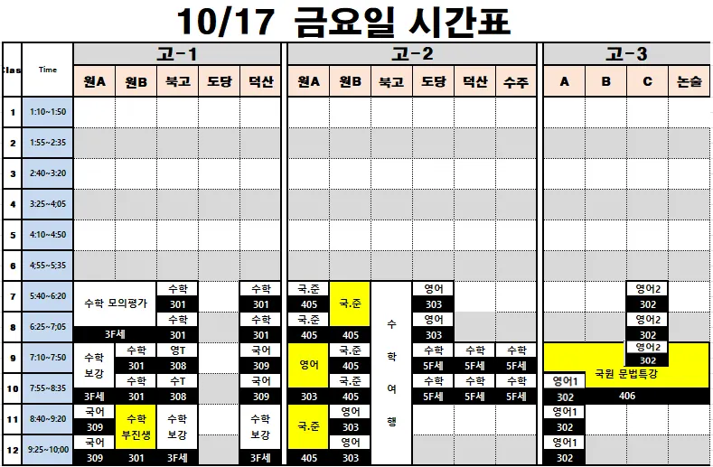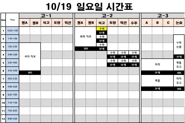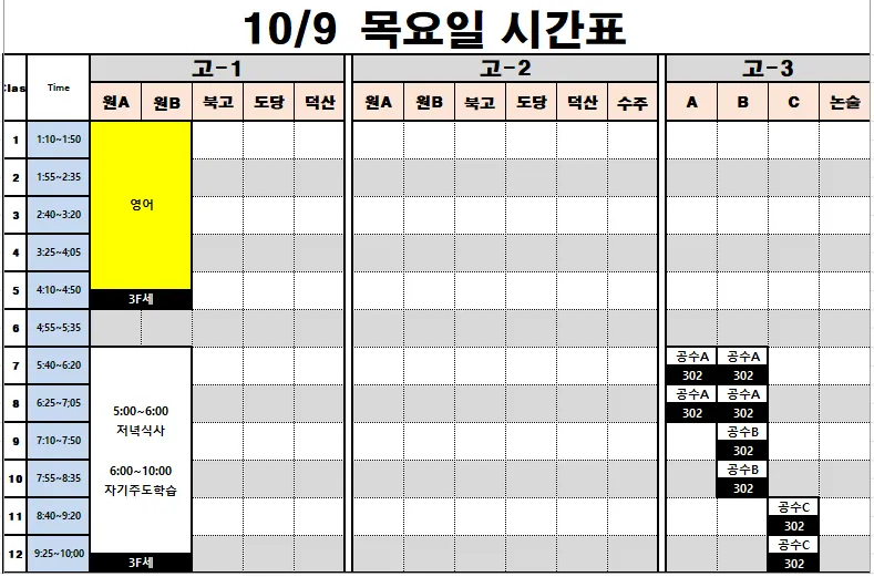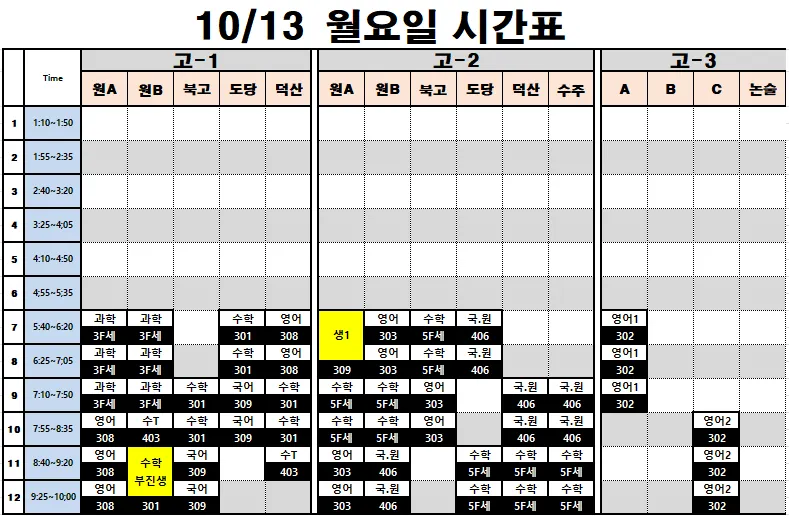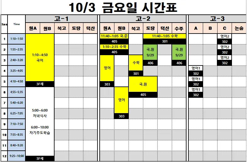 10월6일~10월10일(월~금요일) 주중시간표(10/1기준)