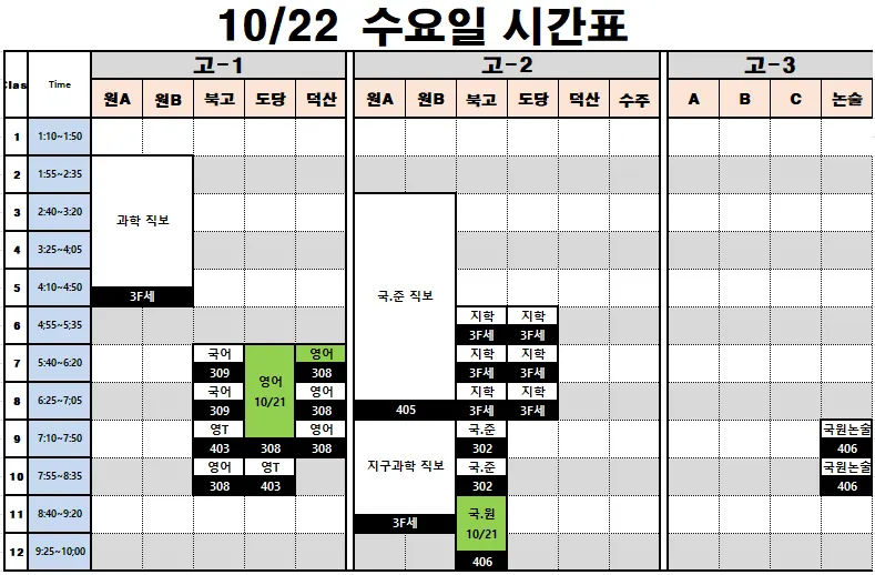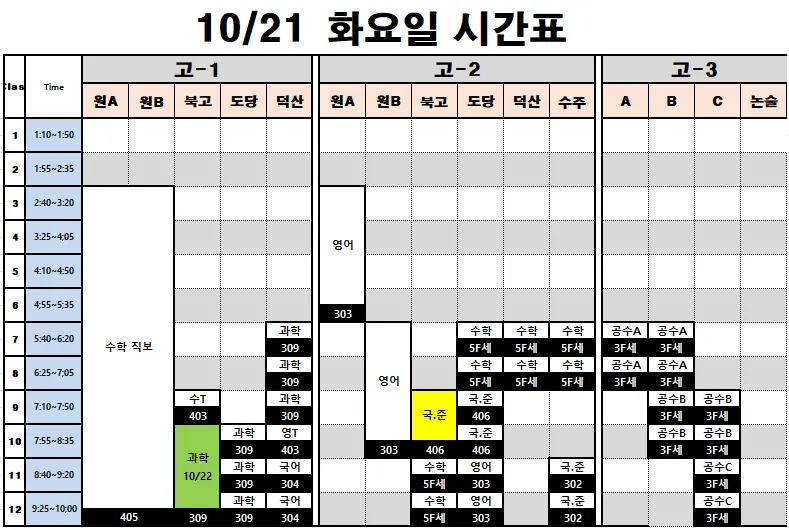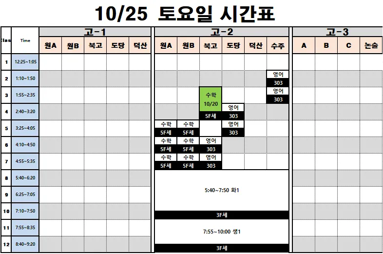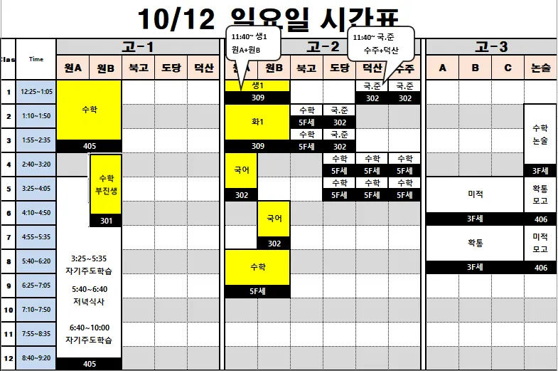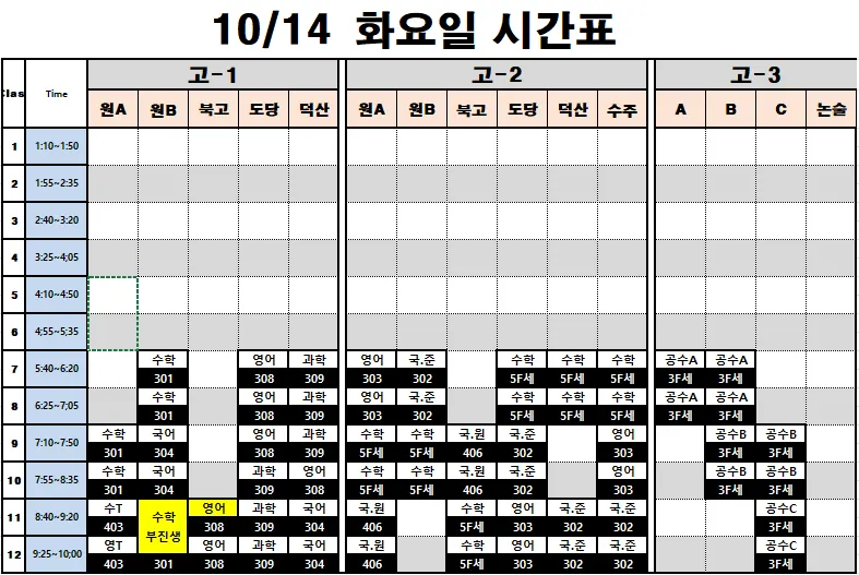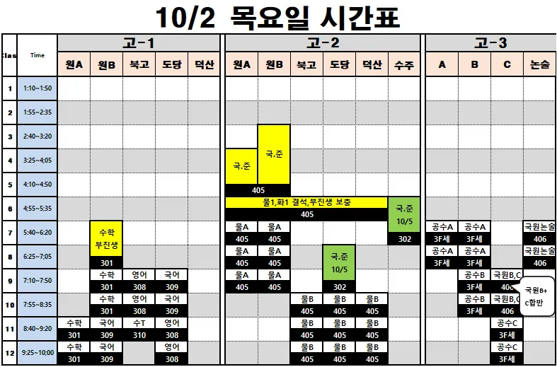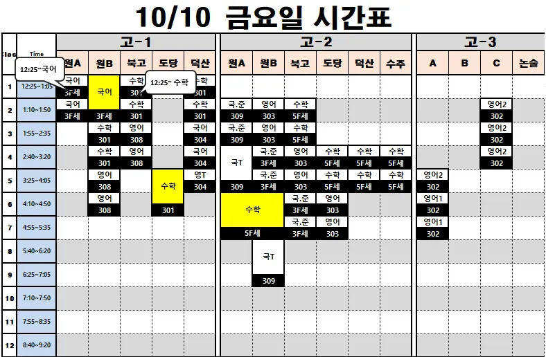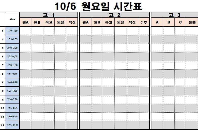 10월6일~10월10일(월~금요일) 주중시간표(10/1기준)