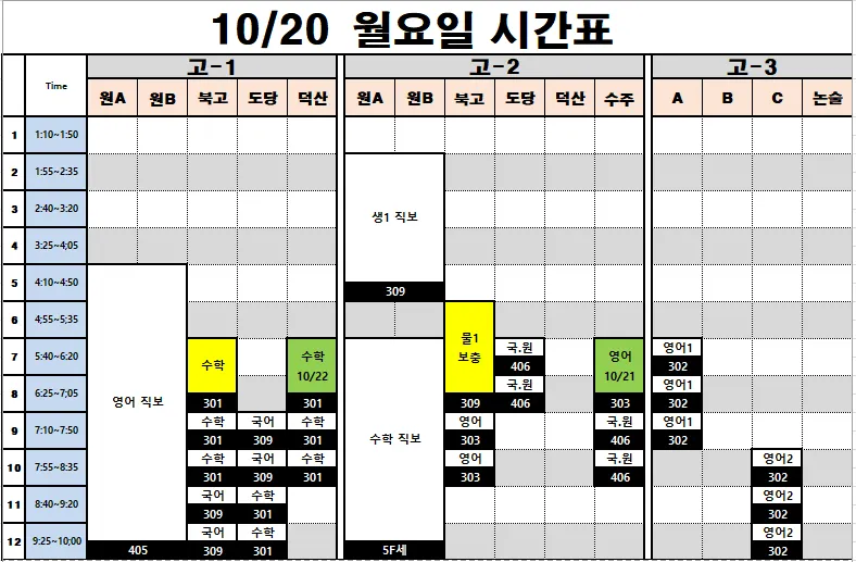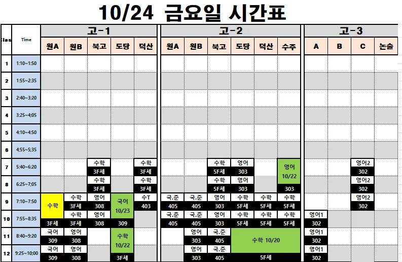 10월20일~10월24일(월~금요일) 주중시간표-수정(10/23기준)