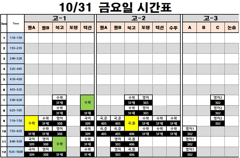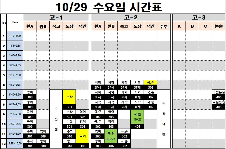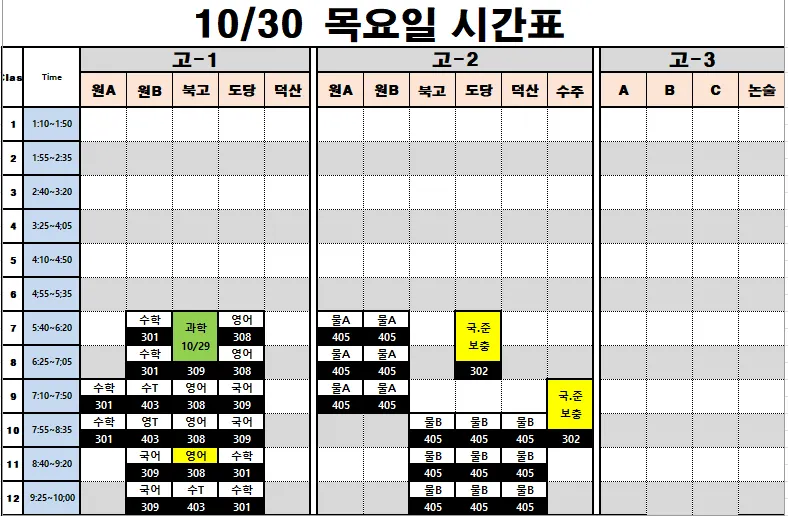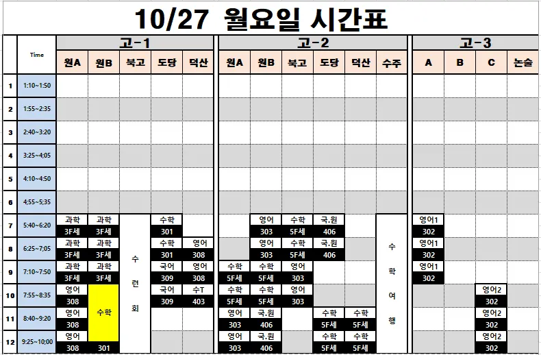 10월27일~10월31일(월~금요일) 주중시간표-수정(10/30기준)