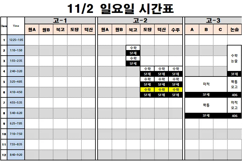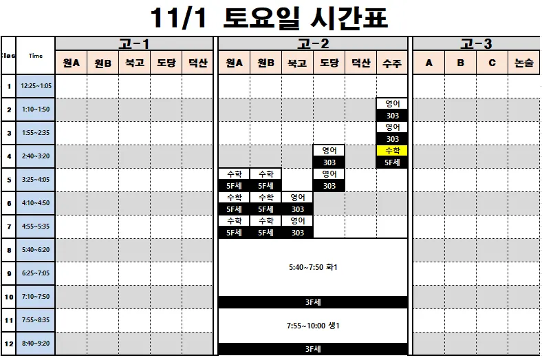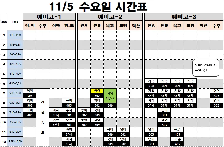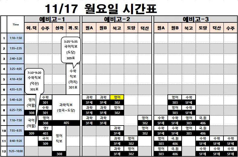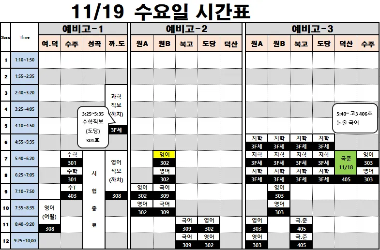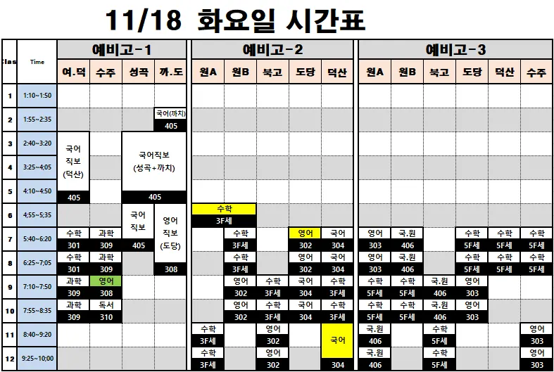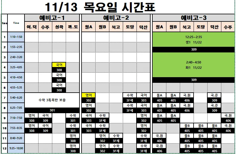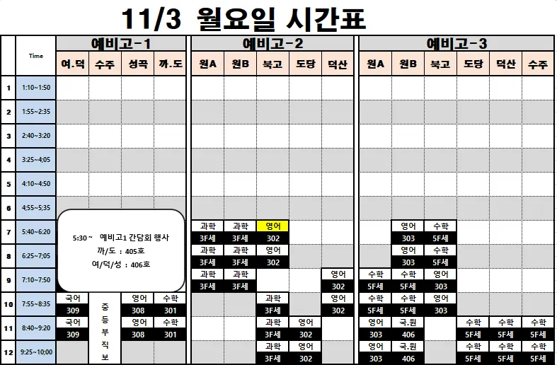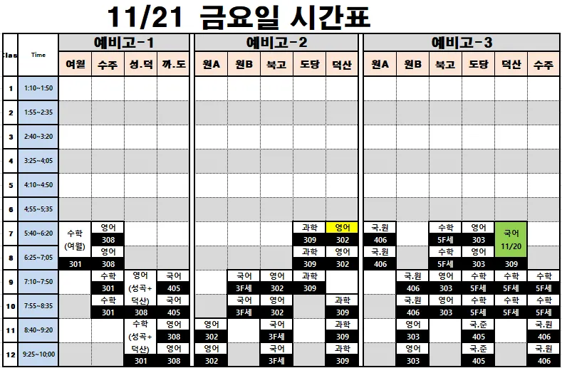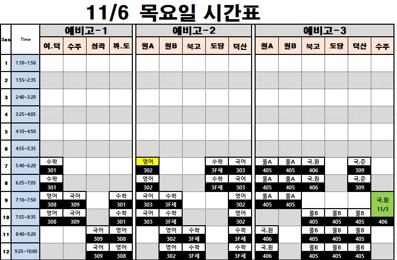 11월3일~11월7일(월~금요일) 주중시간표-수정(11/4기준)