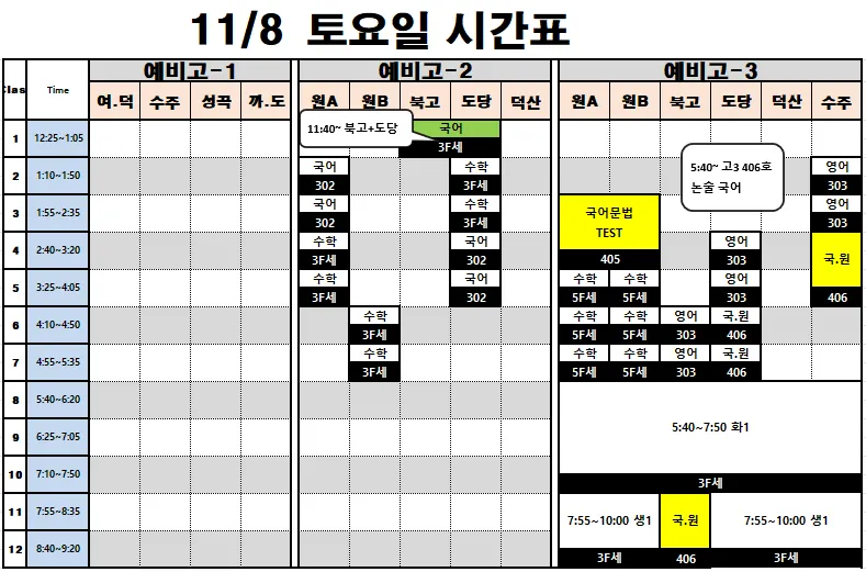11월8일~11월9일(토~일요일) 주말시간표-수정(11/7기준)