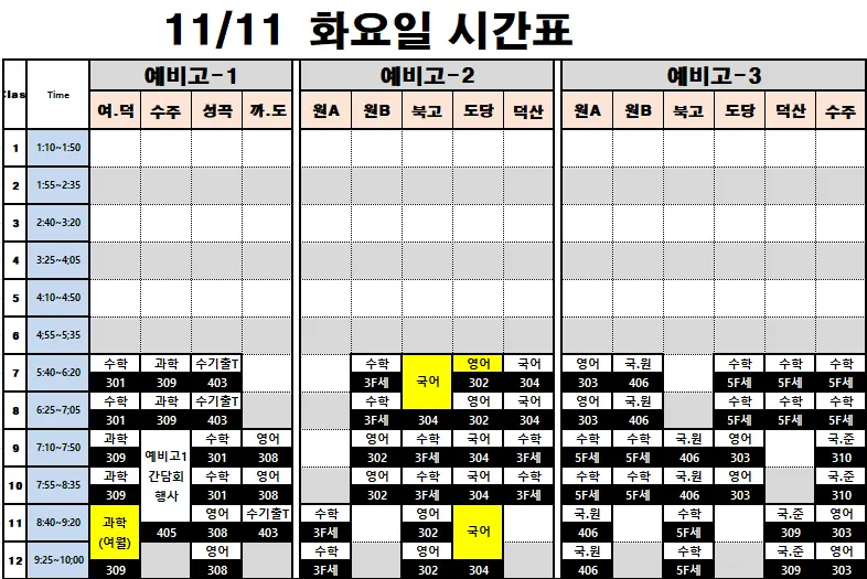11월10일~11월14일(월~금요일) 주중시간표-수정(11/11기준)