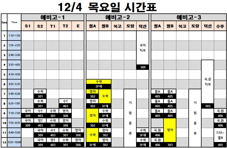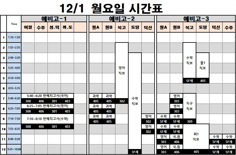 12월1일~12월5일(월~금요일) 주중시간표-수정(12/4기준)