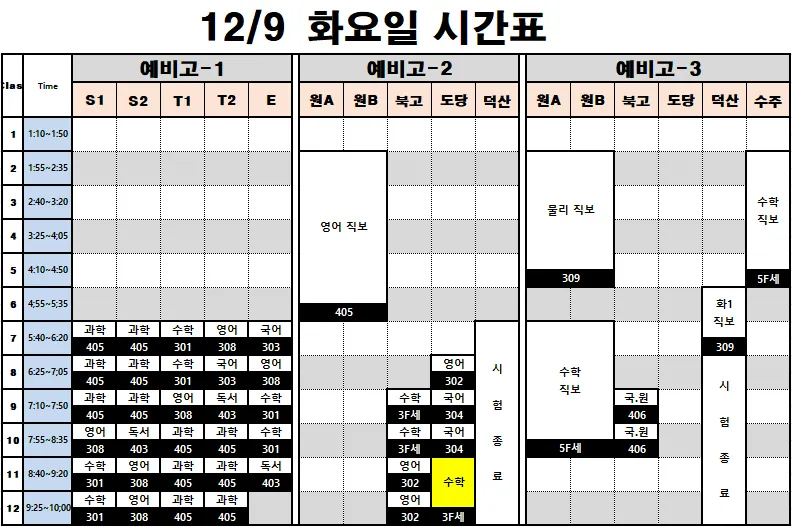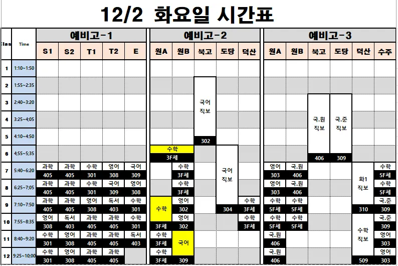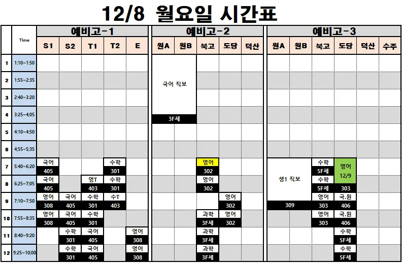 12월8일~12월12일(월~금요일) 주중시간표-수정(12/8기준)