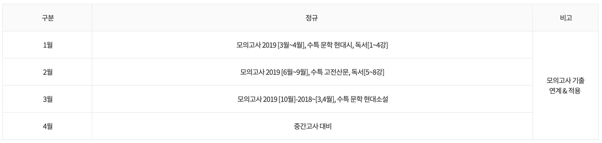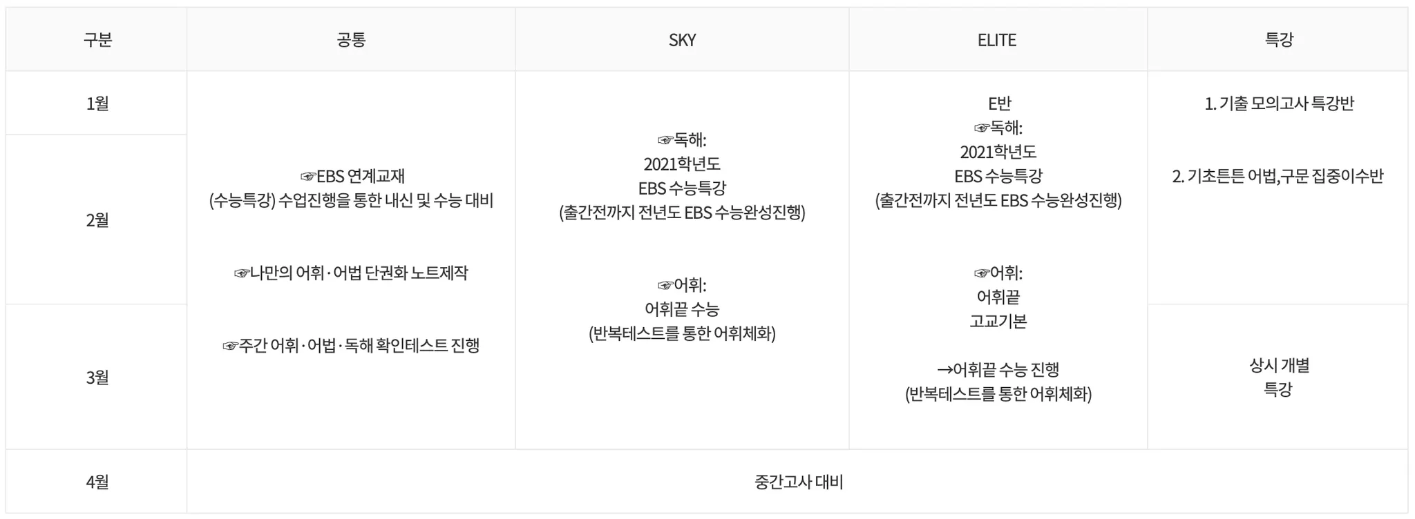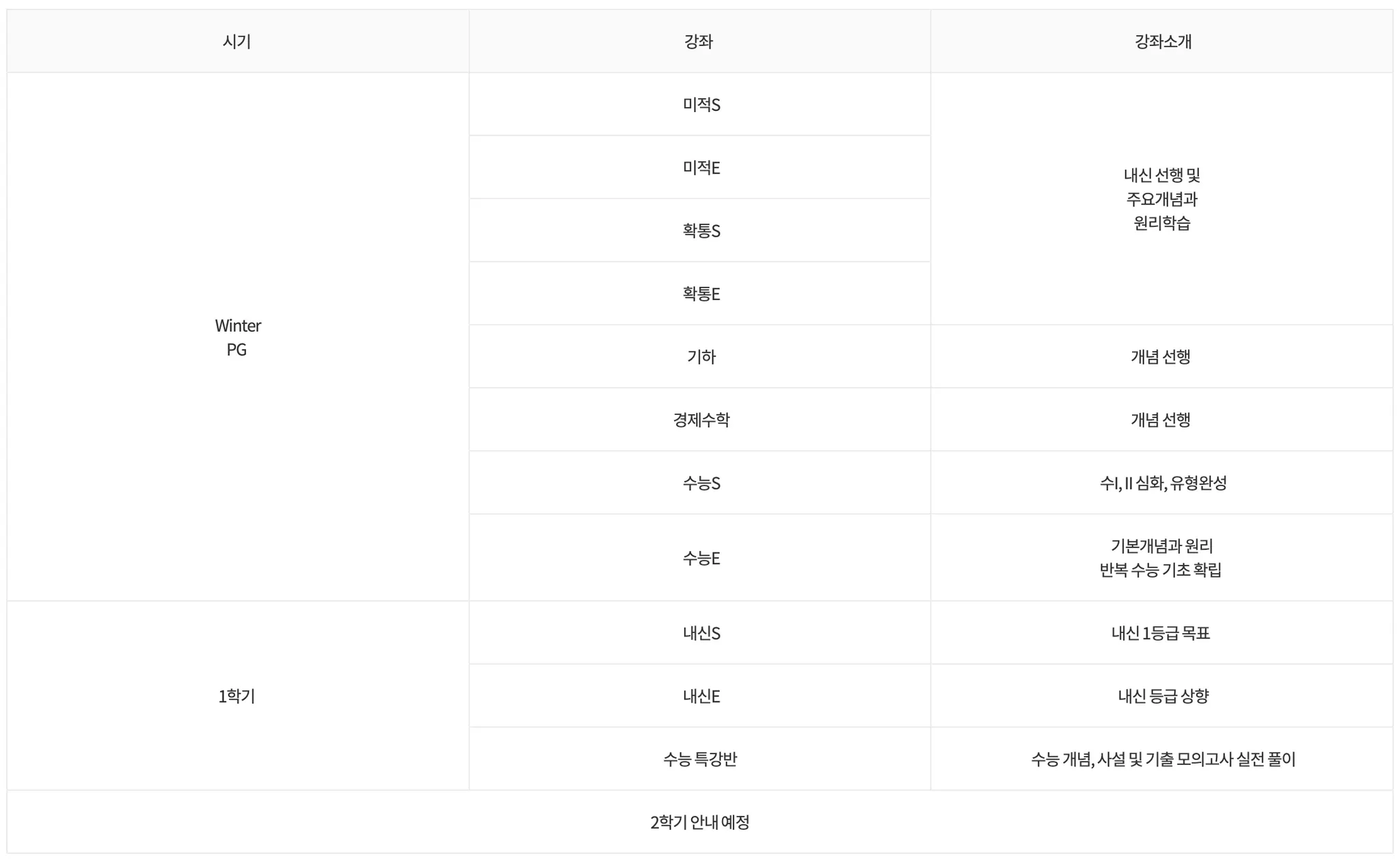과정에 따라 주 2회 또는 3회 수업을 기본으로 운영하고 있으며 내신 기간 종료 후 수능 FINAL 과정으로 운영합니다. 심층면접과정을 같이 준비하고 있으며 내신 3~5등급 학생들을 위한 적성고사 반을 5월부터 운영합니다.