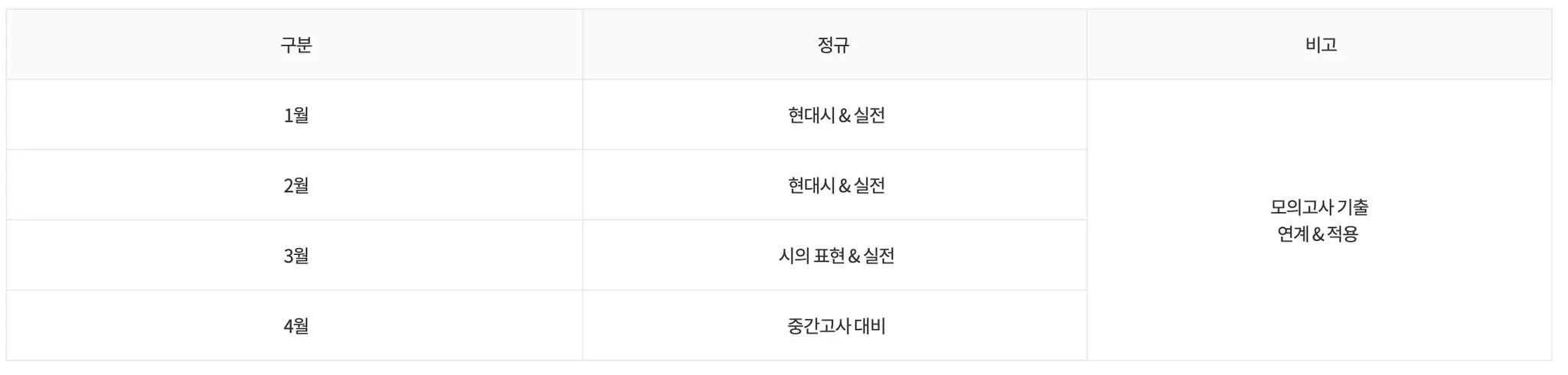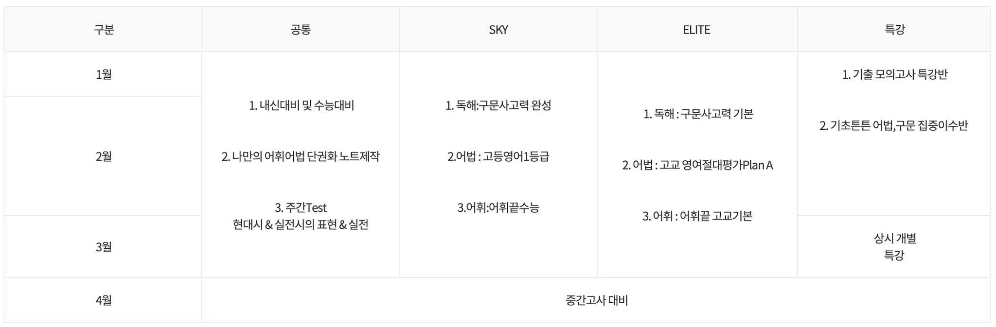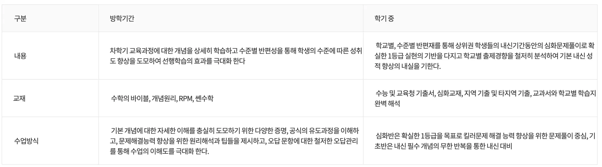국어 / 영어 / 문과수학 / 이과수학 / 확률과 통계(특강) / 사탐 / 물리/ 화학 / 생명 / 지학 과정반을 운영하고 있습니다. 과정에 따라 주 2회 또는 3회 수업을 기본으로 운영하고 있으며, 별도의 테스트 및 보충 수업이 진행됩니다.